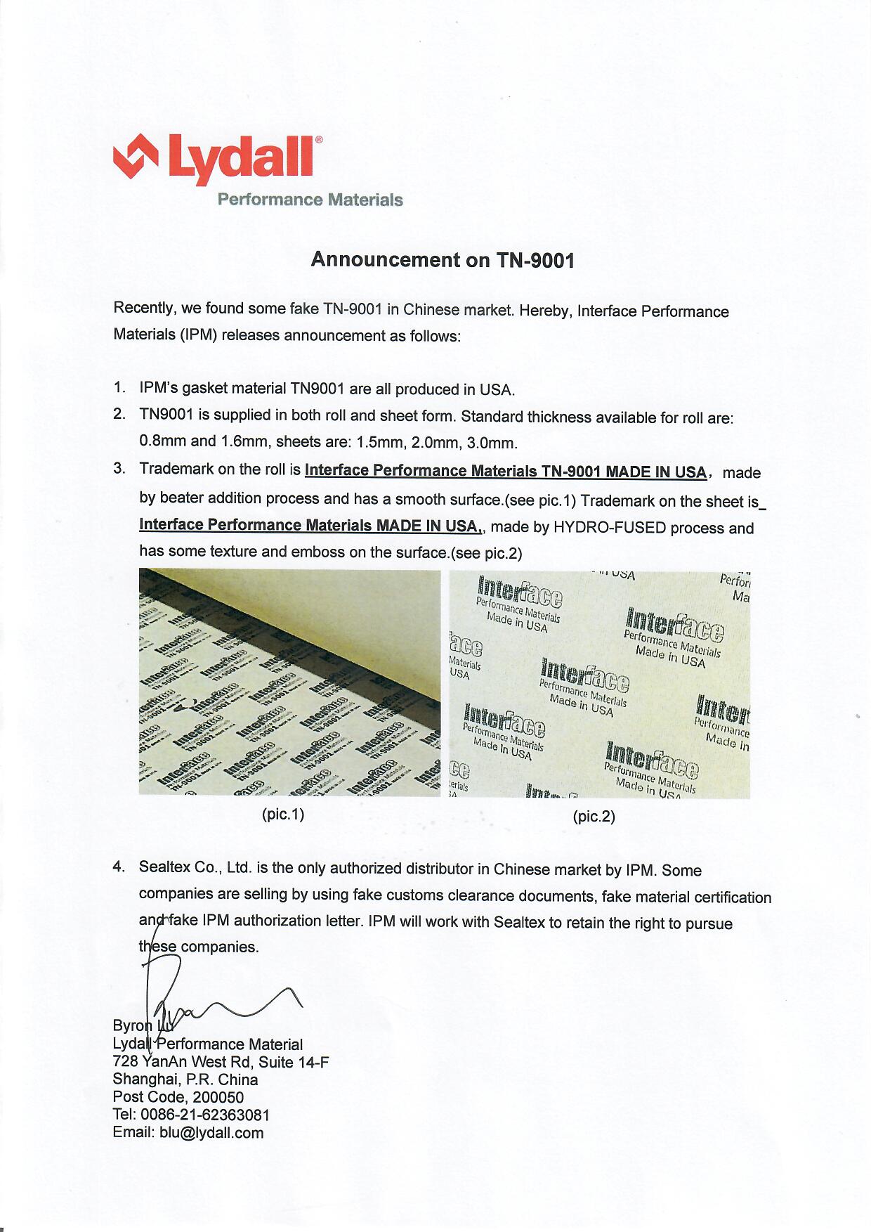 Recently, there are articles on some website teaching how to recognize real Interface’s gasket material TN-9001. TN9001 can be applied to Steam turbine generator which has a high-temperature steam environment . Hereby, Sealtex and Interface jointly release claim as follows......