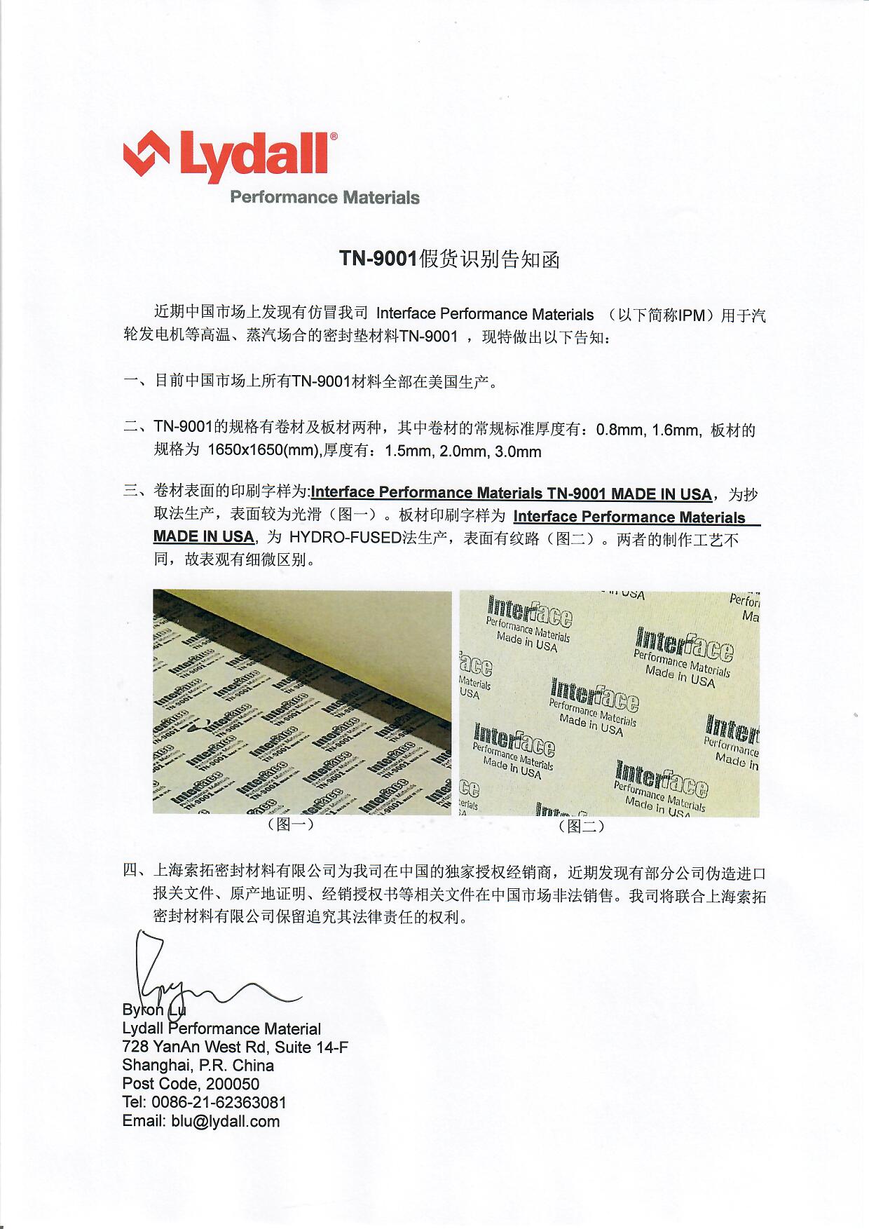 近期中國(guó)市場(chǎng)上發(fā)現(xiàn)有仿冒InterFace Performance Materials用于汽輪發(fā)電機(jī)等高溫、蒸汽場(chǎng)合的密封材料TN-9001,現(xiàn)特作出以下告知: