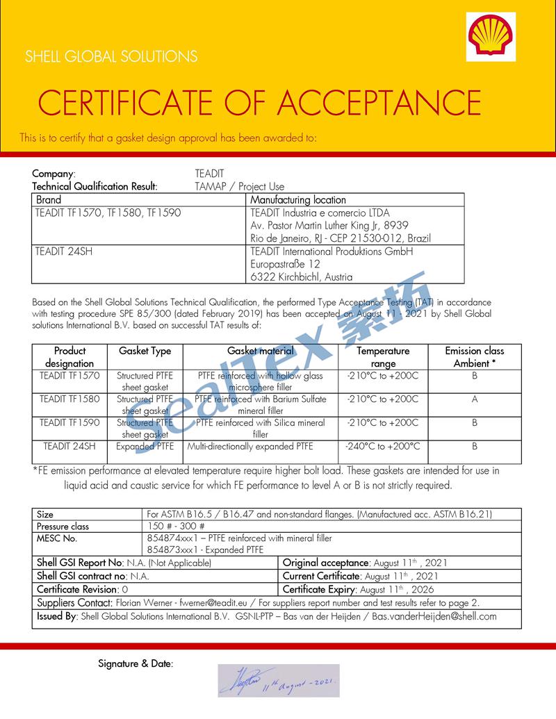 TEADIT/泰迪密封材料獲得石化巨頭殼牌SHELL認(rèn)可