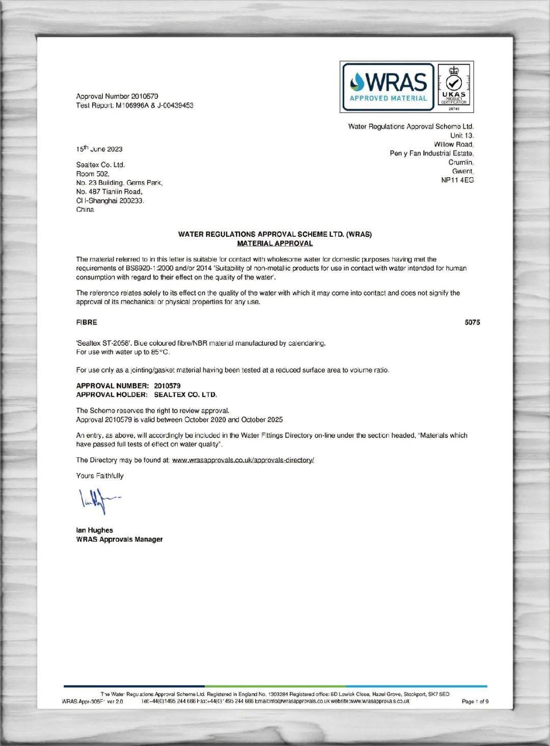 SealTex索拓ST-2058無石棉密封材料通過WRAS(Water Research Advisory Scheme)認證。
