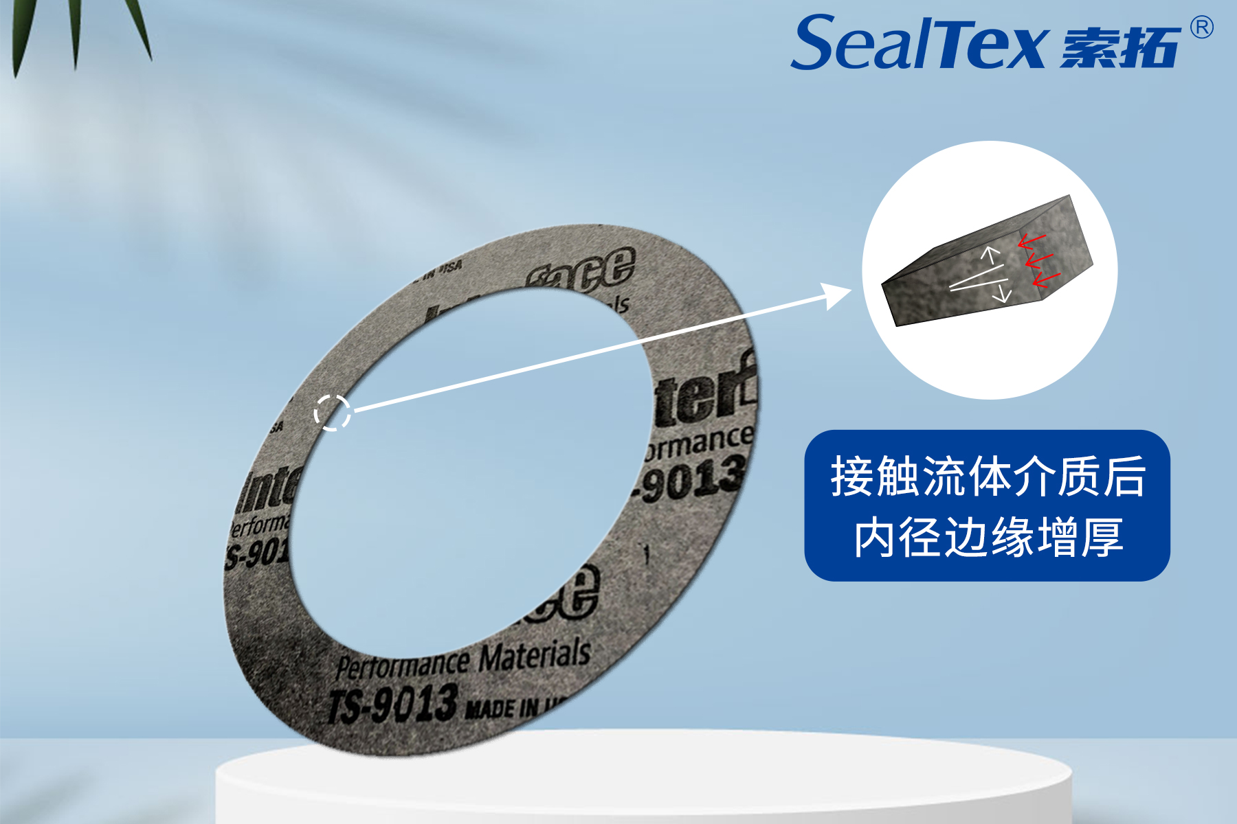 預(yù)硫化的SBR丁苯橡膠與纖維材料、耐高溫填料的復(fù)合結(jié)構(gòu),在接觸水、蒸汽或化學(xué)介質(zhì)后,材料輕微膨脹,填補法蘭面的微小缺陷,顯著降低泄漏風(fēng)險。這種材料墊片厚度的增加只發(fā)生在接觸流體中的墊片內(nèi)邊緣。升溫后材料會被硫化因而減緩了進一步膨脹,會產(chǎn)生全硫化現(xiàn)象加強了密封性能。